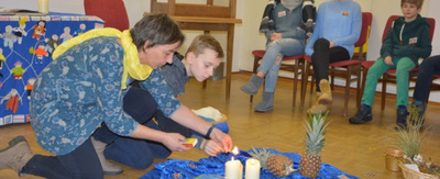 Während des Vorlesens entstand die Schöpfungsgeschichte mit vorbereiteten Materialien in der Mitte des Stuhlkreises. Aufmerksam und interessiert lerrnten die Kinder das Land Surinam kennen, und bestaunten die vielen Darstellungen der Tiere und Menschen. Mit leckeren Spießen aus frischen Früchten stärkten sich die Kinder und Jugendlichen in einer Pause, die sie zuvor zusammen stellten.