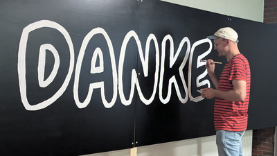 Gestaltet hat diese große Wand Philipp Nicolaus, Pfarrer in der Wesermarsch, gemeinsam mit Jugendlichen und Sandra Bohlken, Kreisjugenddiakonin in der Wesermarsch. Weitere kleine Tafeln haben Jugendliche aus Elsfleth vorbereitet, auf denen in verschiedenen Sprachen „Danke“ steht. Kleine freie Tafeln werden im Zelt hängen, die noch mit weiteren Sprachen beschriftet werden können.