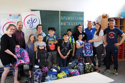 Im Rahmen des Projektes Ene Mene Muh der Ev. Jugend Oldenburg Stadt (ejo) wurden Ende Mai 24 gefüllte Schulrucksäcke mit Federmappe und Sporttasche an 4. Klässler in der Grundschule Dietrichsfeld übergeben.