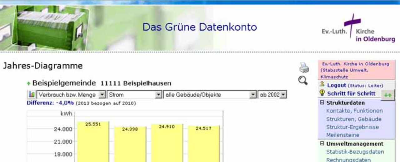 Kirchengemeinden und kirchliche Einrichtungen der Evangelisch-Lutherischen Kirche in Oldenburg können ab sofort kostenlos ins Energiemanagement einsteigen. Dazu steht das Grüne Datenkonto zur Verfügung, das von einer Anwendergemeinschaft von acht evangelischen Landeskirchen unter ihnen die Ev.-Luth. Kirche in Oldenburg betrieben wird. Hinter dem Namen Grünes Datenkonto verbirgt sich eine Internet-Datenbank, über die insbesondere Energieverbräuche und -kosten erfasst und transparent gemacht werden können. Dies ist ein erster Schritt zu mehr Energieeffizienz und zur Senkung der Betriebskosten.