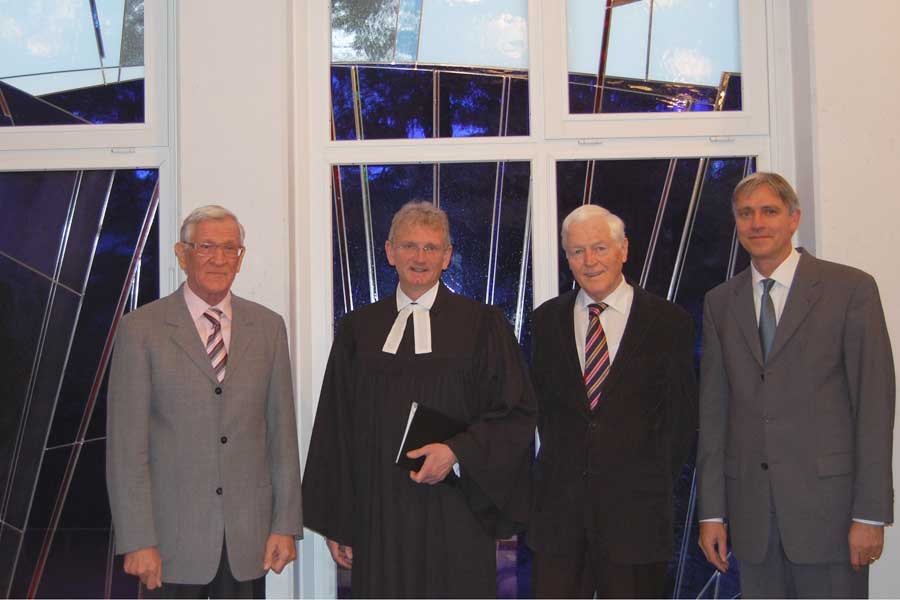 Die Ideen des Künstlers seien sofort auf breite Zustimmung gestoßen, erinnerte Achim Knöfel an die anfängliche Planung. Der Weg vom Entwurf zur Fertigstellung war allerdings wie so oft sehr mühselig, galt es doch, eine Summe von insgesamt 142.000 Euro zu finanzieren. Wahrlich eine gewaltige Aufgabe für eine nicht gerade reiche Vorortgemeinde. Knöfel lobte den unermüdlichen Einsatz des damaligen Pfarrers Jürgen Schwartz bei der Einwerbung von Spenden, die sowohl den ersten als auch den zweiten Bauabschnitt ermöglicht haben. Beide Bauabschnitte wurden mit Geldern aus der Kirchbaustiftung unterstützt. Der mit Pfarrer Schwartz begonnene Weg kommt mit seinem Nachfolger, Pfarrer Behrens, an sein Ziel: Der Gottesdienstraum hat sich durch die leuchtende Farbigkeit und ausdrucksstarke Gestaltung seiner Fenster in einen richtigen Kirchensaal verwandelt.