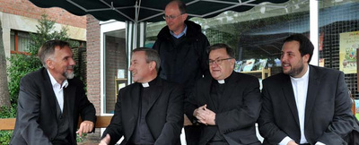 Seit Montag steht die alte Kirchenbank vor der Propsteikirche in Vechta. Jeden Tag von 8.00 bis 18.00 Uhr. „Kommt und ruht ein wenig aus“, steht auf einer kleinen Tafel daneben – ein Zitat aus dem Markusevangelium. „Die Menschen nehmen das Angebot wirklich an“, konnte heute Pastoralreferent Daniel Richter dem Vechtaer Weihbischof Wilfried Theising und Bischof Jan Janssen aus Oldenburg bestätigen, die die Outdoor-Kirchenbank selbst ausprobieren wollten. Ob es fünf Frauen waren, die hier saßen und um einen Reisesegen baten, eine Flüchtlingsfamilie, die hier Rast machte oder viele Einzelpersonen – immer wieder sitzen Passantinnen und Passanten auf der Bank.
