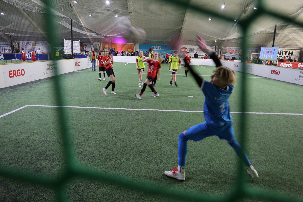 Jule Corleis ist für Wettbewerb definitiv zu haben. Die 13-Jährige schießt in ihrer Freizeit Tennisbälle übers Netz und mit dem Luftgewehr auf Zielscheiben. Den Ball ins Tor trifft die Konfirmandin aus Harsefeld bei Stade bislang nicht - aber rechtzeitig zum Konfi Cup hat sie Fußball in ihr Repertoire aufgenommen. Ihre Kirchengemeinde hat eine wechselhafte Historie bei dem Wettbewerb: 2018 gewann ein Team in Hannover und später auch beim Bundeswettbewerb in Köln, 2025 wurde es dagegen etwa nur der enttäuschende 14. Platz. Für den Anlauf in diesem Jahr ist Kaya Dupré als Trainerin am Start, die selbst in der Bezirksliga spielt. „Es macht mir einfach mega Spaß mit dieser tollen Gruppe“, sagt die 14-Jährige und Spielerin Jule fällt ihr sofort ins Wort: „Sie hat uns erst heute Morgen das Dribbeln beigebracht!“. Da muss Kaya dann doch grinsen.