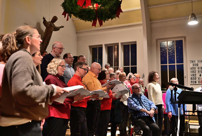 Seit Freitagabend probten 58 Sänger und Sängerinnen unter der Leitung von Wolfgang Zerbin aus Rommerskirchen begeistert die 10 Songs aus dem adventlichen Werk „Unerwartet anders“. Das Chorwerk umfasste Pop- und Gospel-Stilistik mit deutschen Texten. Verbindende Zwischenmoderationen haben das bekannte Advents- und Weihnachtsgeschehen auf neue und frische Art lebendig werden lassen und bildeten gleichermaßen die Überleitungen zu den modernen Songs.