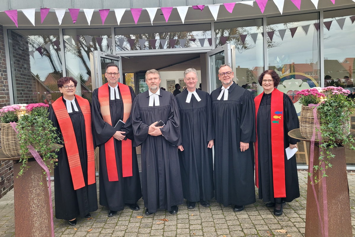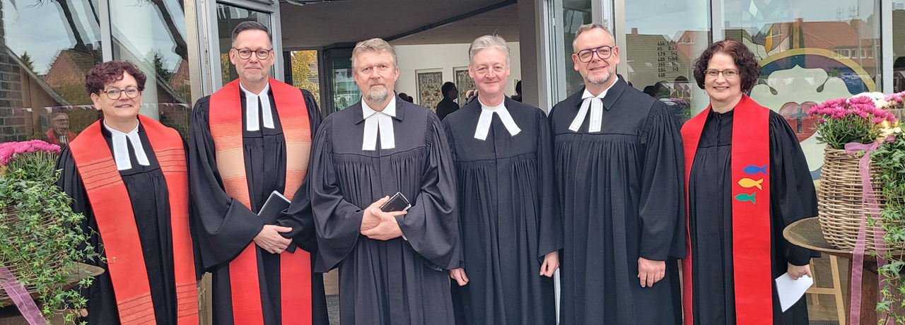 Das 25. Ordinationsjubiläum von vier Pfarrern und zwei Pfarrerinnen der oldenburgischen Kirche fand am Reformationstag, 31. Oktober, in der ev.-luth. Emmauskirche in Visbek statt. Ort und Zeitpunkt wurden gewählt, weil im Jahr 2000 die Ordination, die feierliche Einführung der Pfarrpersonen in ihr Amt als Pfarrer oder Pfarrerin, auch am 31. Oktober in Visbek stattfand. Die sechs Pfarrer*innen versehen nach ihrer Ordination ihren Dienst an verschiedenen Orten im Oldenburger Land: Andrea Hilgen Frerichs und Carsten Hilgen besetzen die Pfarrstellen in Visbek und Langförden, Christian Scheuer ist Kreispfarrer im Ev.-luth. Kirchenkreis Friesland-Wilhelmshaven, Pfarrerin Doris Möllenberg ist in Wilhelmshaven, Pfarrer Christian Egts in Holle Wüsting und Pfarrer Tessen von Kameke ist bereits im Ruhestand.