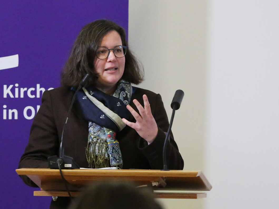 Weiter berichtete sie, dass die EKD ihre Friedensethik mit der Denkschrift „Welt in Unordnung – Gerechter Friede im Blick“ grundlegend aktualisiert habe. Angesichts veränderter Sicherheitslagen, hybrider Bedrohungen und neuer Kriege betone diese den Schutz von gefährdeten Menschen als Gebot der Nächstenliebe. Gewalt bleibe nur als letztes Mittel verantwortbar und stets ethisch zu prüfen.
