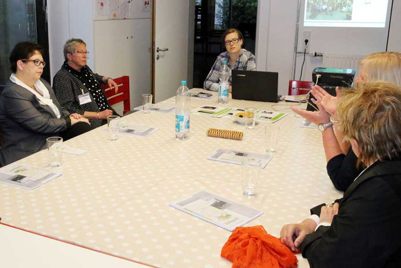 In der Gesprächsrunde im Nachbarschaftsbüro Düsternort des Diakonischen Werkes informieren sich Synodale über die dortige Arbeit. Das Ziel ist es, mit dem und für den Stadtteil die Lebensbedingungen für die Bewohnerinnen und Bewohner positiv zu gestalten. Foto: Hans-Werner Kögel