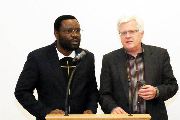 Der Moderator der Evangelisch-Presbyterianischen Kirche Togos, Pastor Paul Avinou, überbrachte die Grüße der afrikanischen Partnerkirchen. Gedolmetscht wurde das Grußwort von Pastor Hannes Menke (re.), Generalsekretär der Norddeutschen Mission.