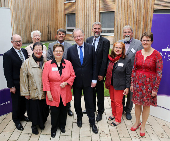Ministerpräsident Stephan Weil besucht die Synodentagung der oldenburgischen Kirche (von li. nach re.): Oberkirchenrat Detlef Mucks-Büker, Präsidiumsmitglied Birgit Osterloh, Oberkirchenrätin Annette-Christine Lenk, Synodenpräsidentin Sabine Blütchen, Präsidiumsmitglied Jost Richter, Ministerpräsident Stephan Weil, Bischof Jan Janssen, Präsidiumsmitglied Anke Helm-Brandau, Präsidiumsmitglied Pfarrer Kai Wessels, Oberkirchenrätin Dr. Susanne Teichmanis.